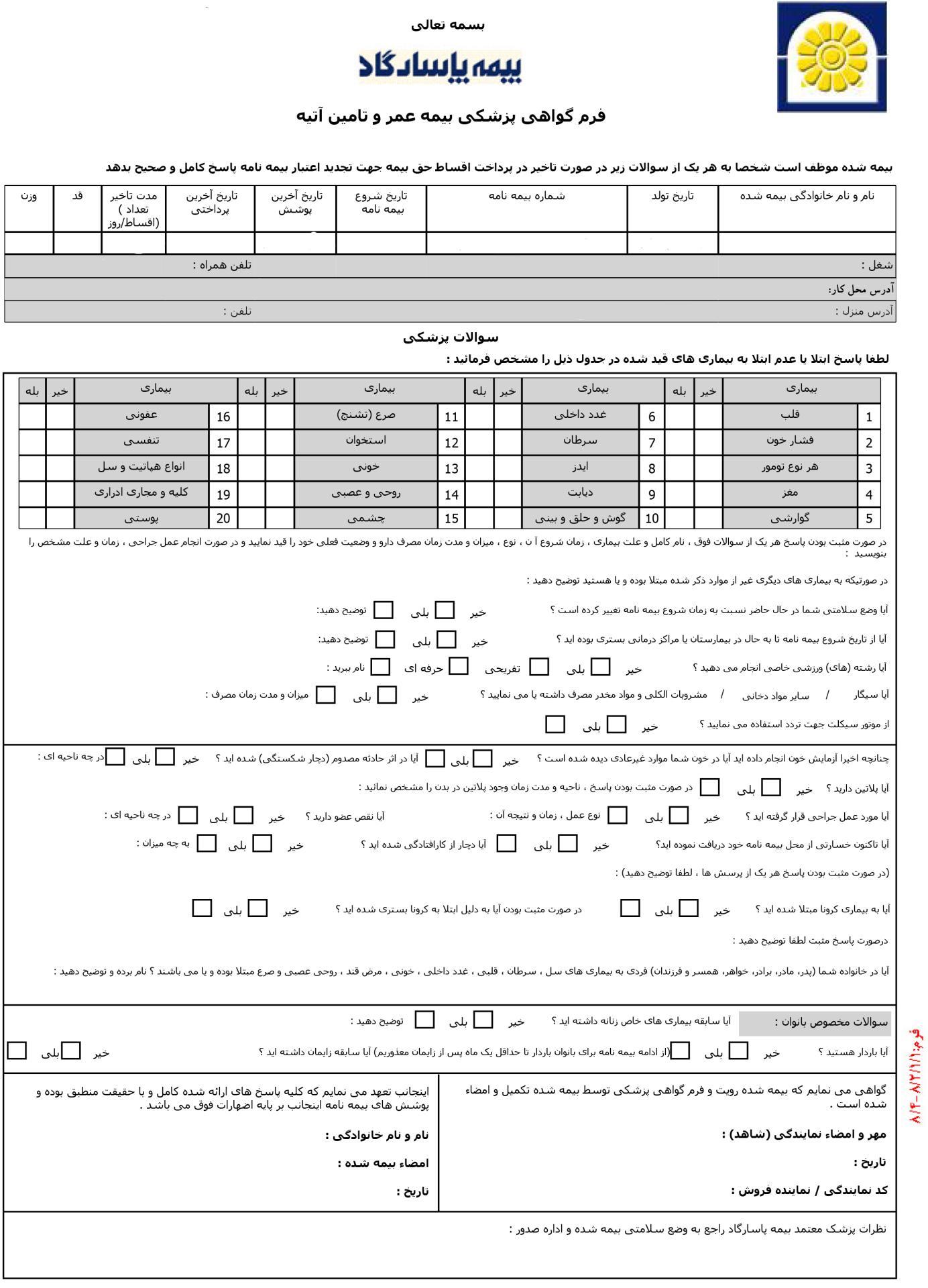 - فرم گواهی پزشکی مربوط به وضعیت سلامتی شخص بیمه شده می باشد و می بایست توسط ایشان تکمیل گردد.