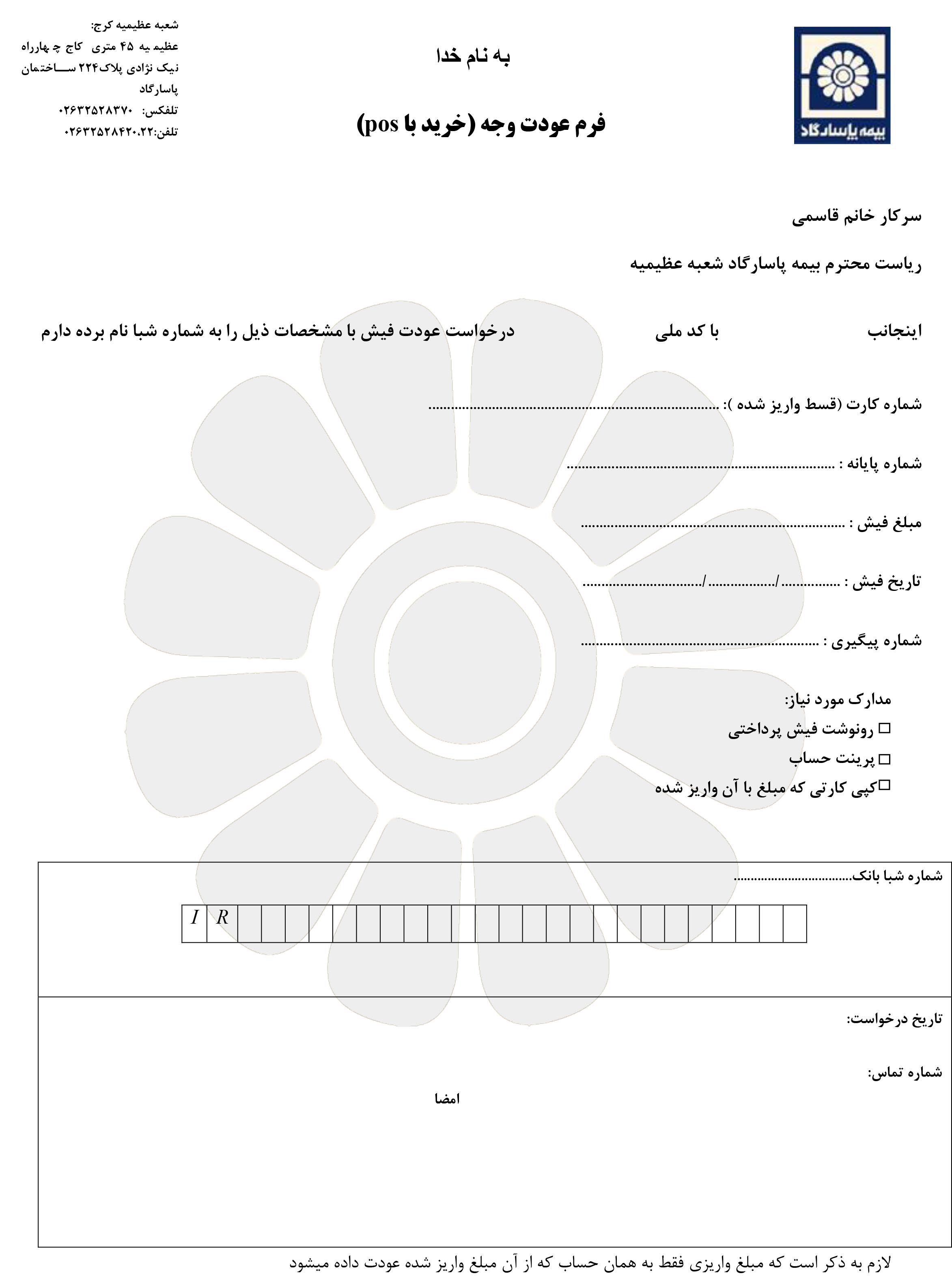 لذا در صورتی که بیمه گذار یا نماینده به اشتباه مبلغ قسط اول بیمه نامه عمر و تامین آتیه را از طریق دستگاه POS شرکت واریز کرده باشد می بایست نسبت به تکمیل فرم درخواست عودت مبلغ واریز شده اقدام نماید.